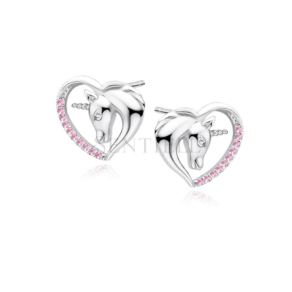 Silver (925) heart earrings - unicorn with pink zirconias and white eye
