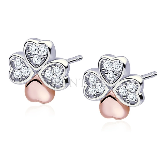 Silver (925) clover earrings with zirconias, rose gold-plated leaf
