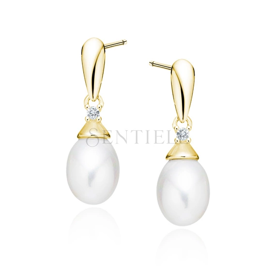 Pendientes de plata de ley 925 chapados en oro con perla y circonitas blancas