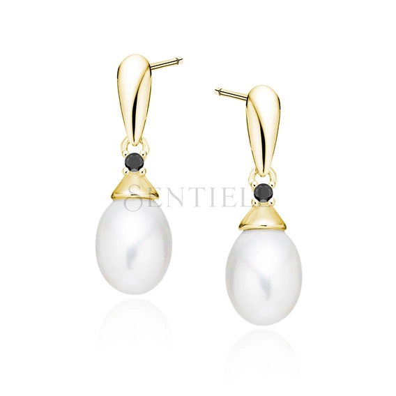 Pendientes de plata de ley 925 chapados en oro con perla y circonitas negras