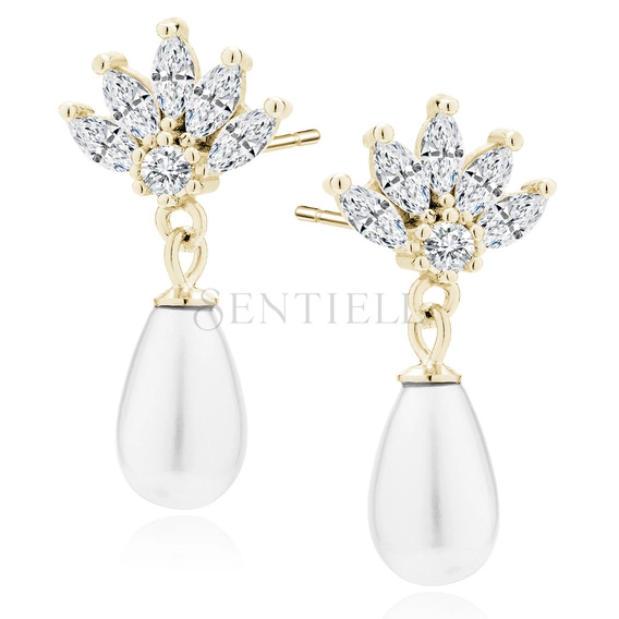 - Pendientes de plata de ley 925 chapados en oro con perla y circonitas blancas