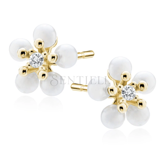 Pendientes de plata de ley 925 chapados en oro - flores con circonitas blancas y perlas