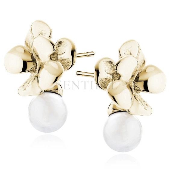 Pendientes de plata de ley 925 chapados en oro con flor y perla